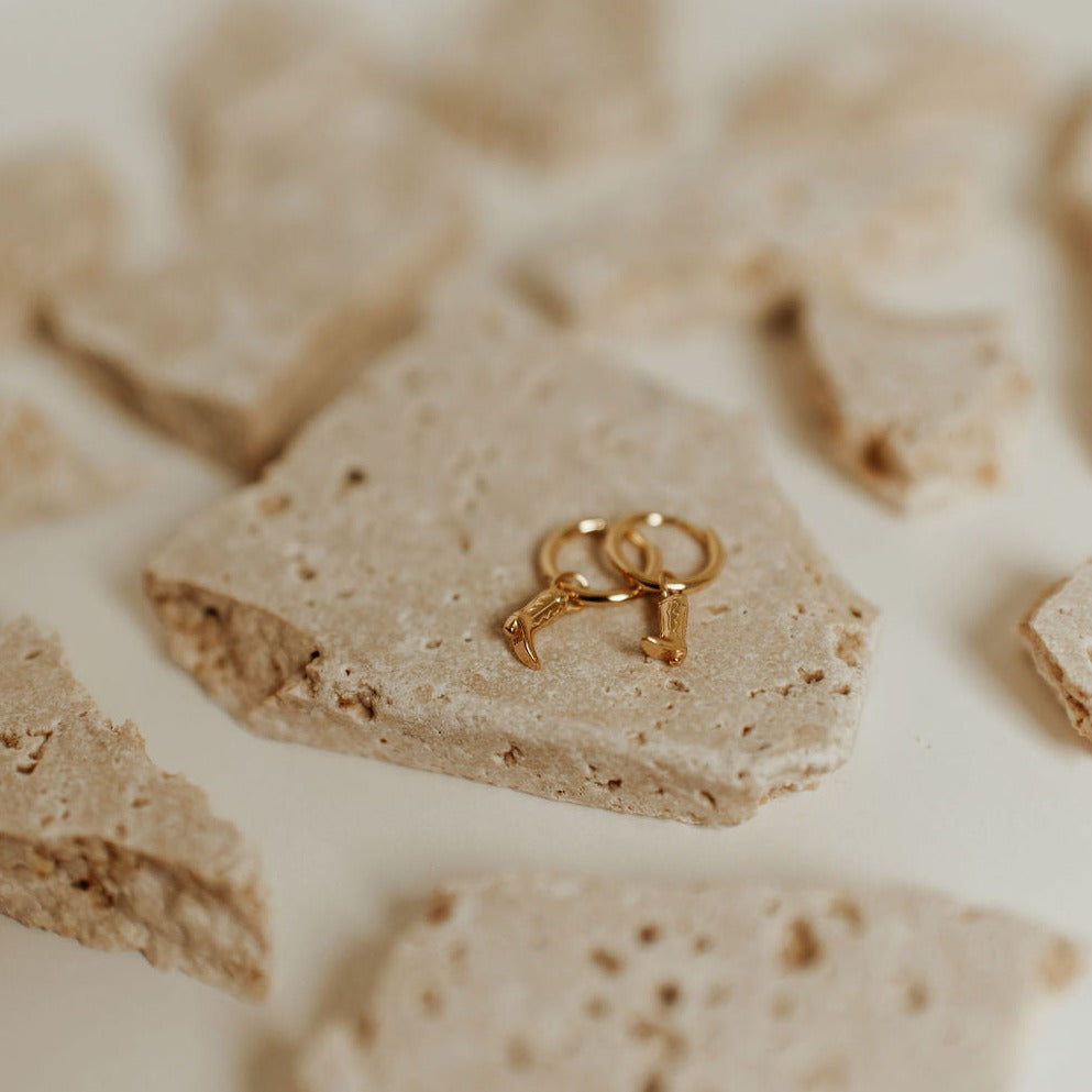 Calling all cowgirls! The Dolly Boot Hoops are the perfect accessory for all our southern gals! Cute little boot charm attached to a dainty, high-quality gold hoop with huggie closure style. Gold vermeil over .925 sterling silver, hypoallergenic, and good for sensitive skin.