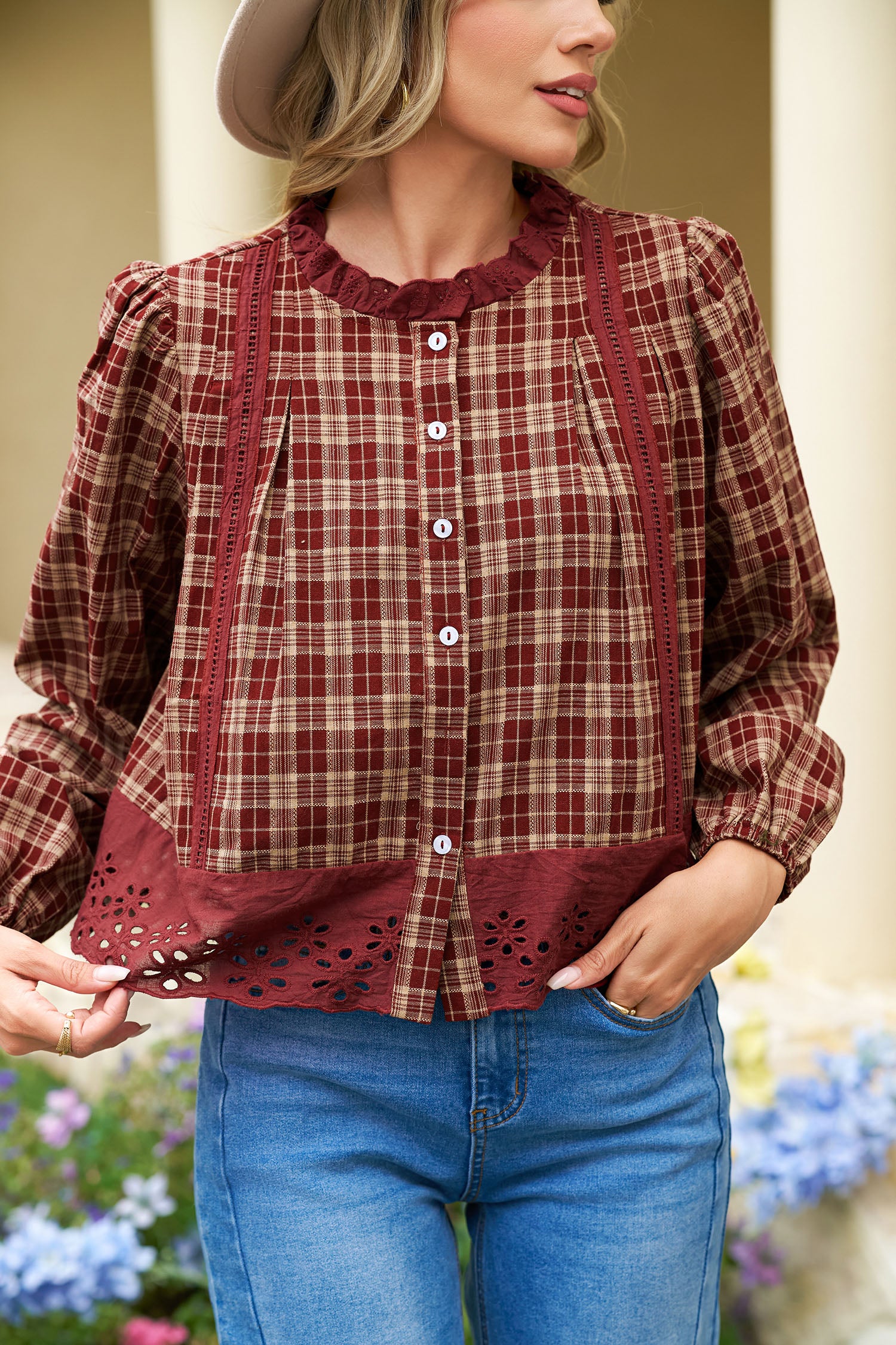 Red Dahlia Plaid Lace Hem Button Down Shirt