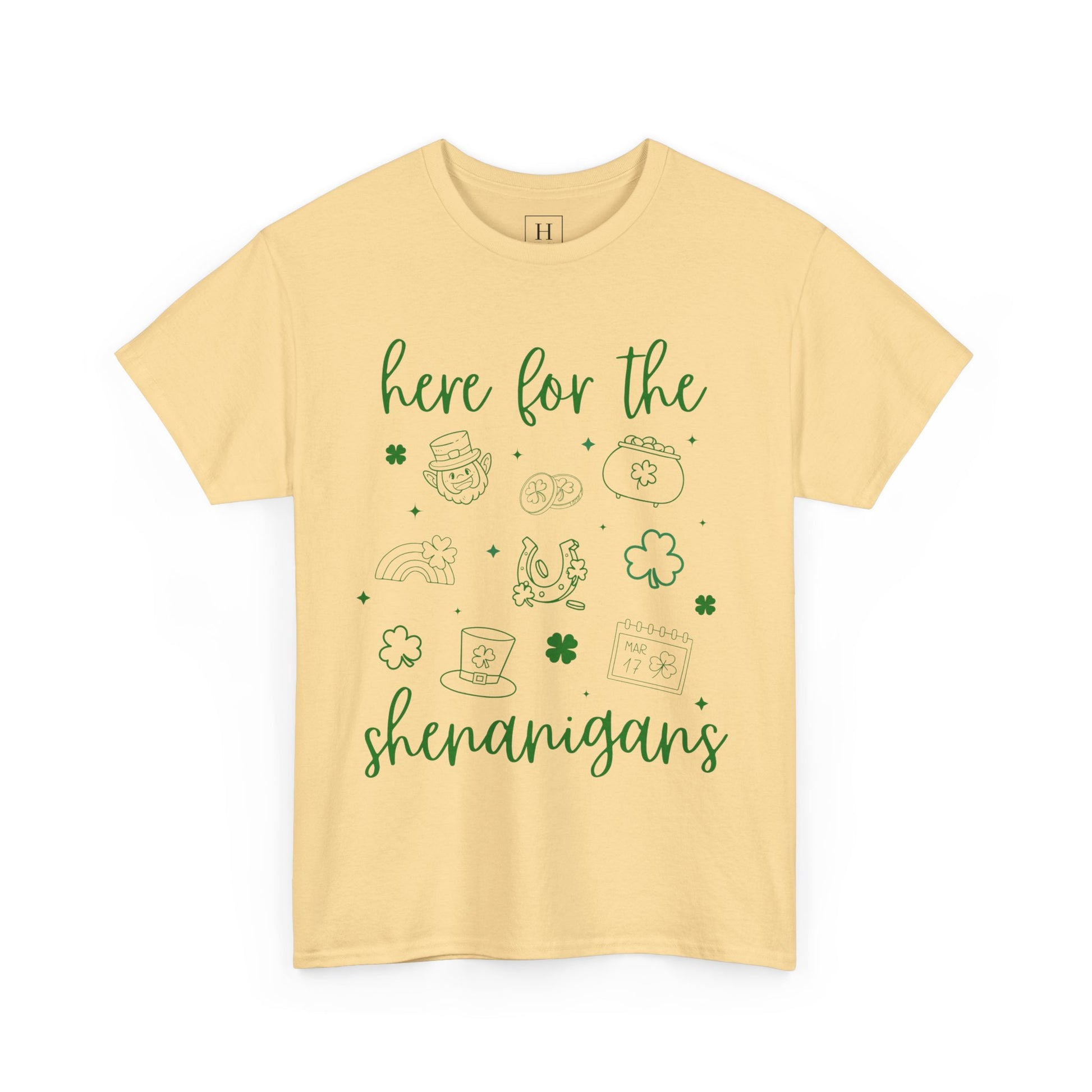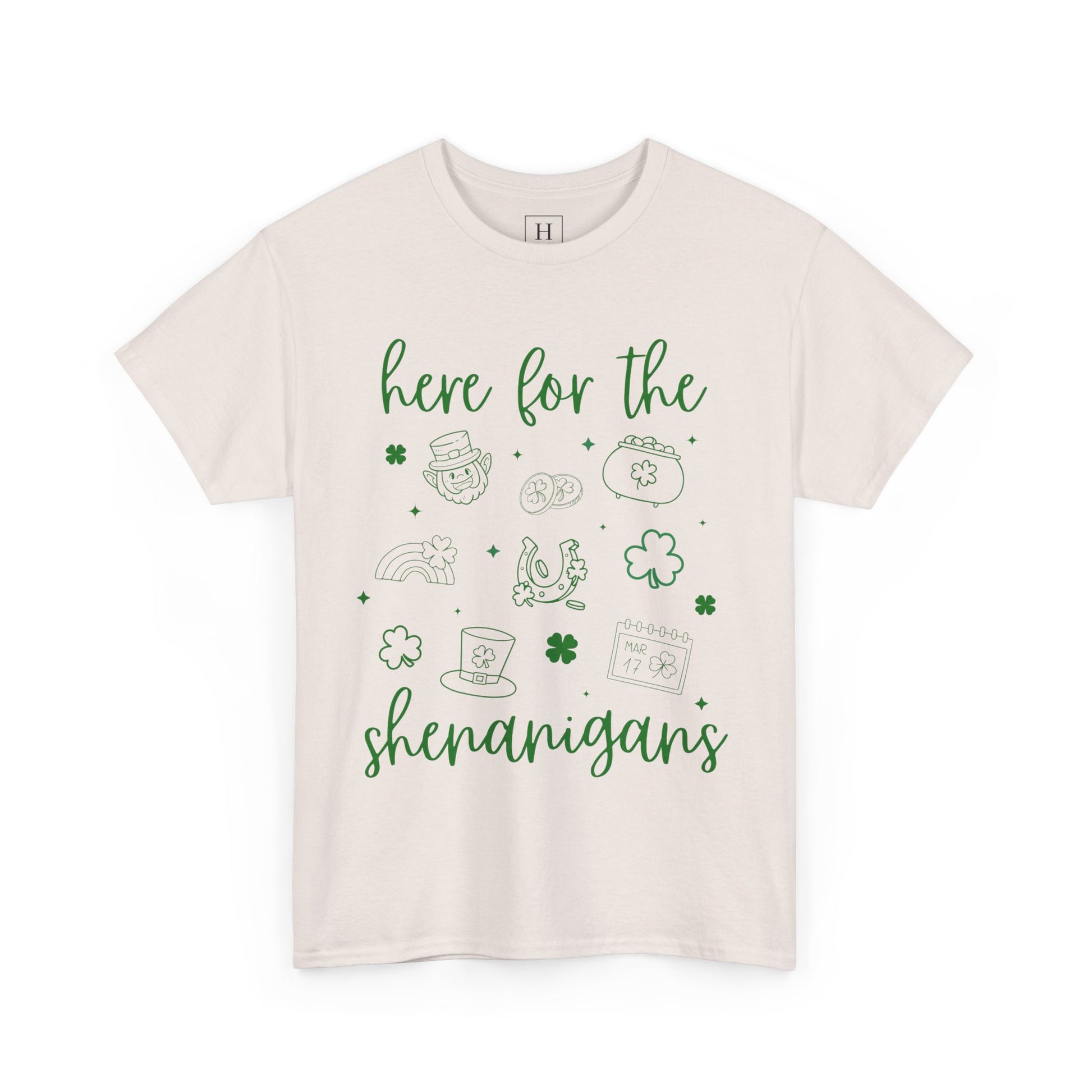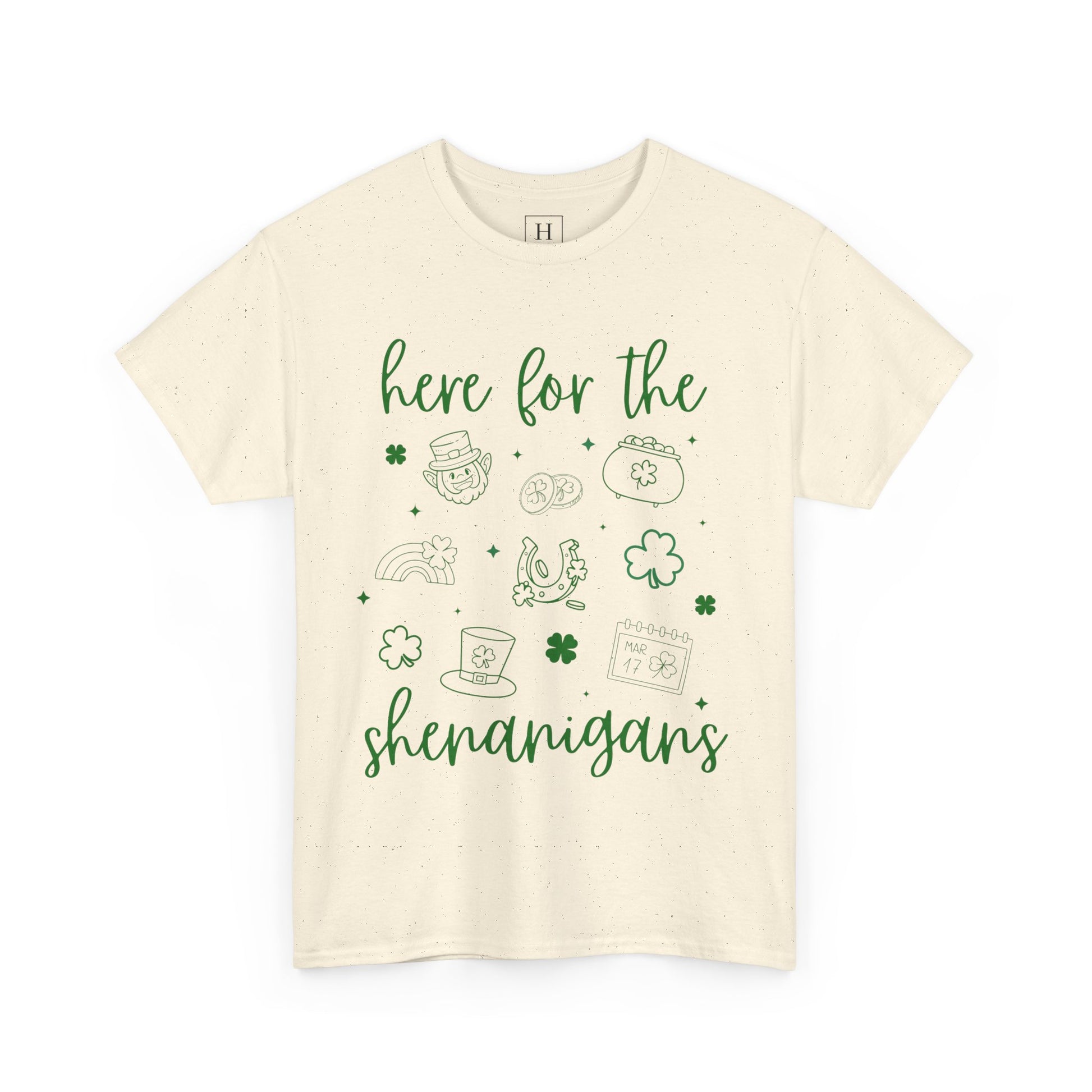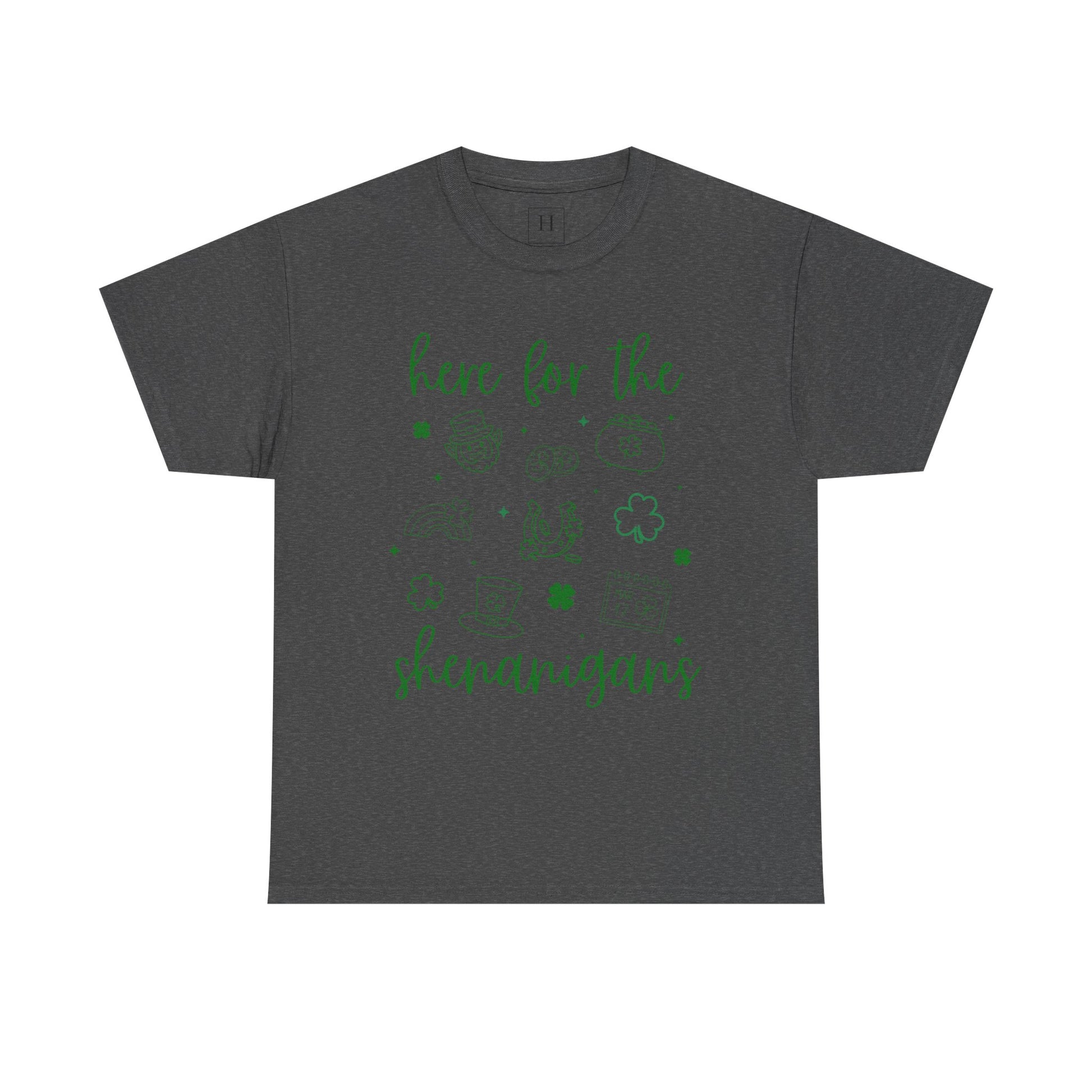 Celebrate St. Patrick's Day in style with this unisex heavy cotton tee featuring the fun message 'st patrick here for the shenangans'. Perfect for those looking to join in the festivities and add a touch of humor to their outfit. Ideal for adults looking to embrace the holiday spirit.